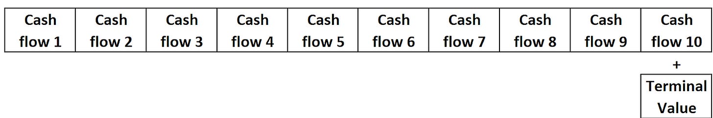 Algo que también podemos señalar aquí es que hay que elegir un horizonte de proyección para el DCF, es decir, cuántos años estimar directamente antes de asumir una tasa de crecimiento a perpetuidad. Lo más habitual es usar un horizonte de 10 años. El flujo de caja del año 10 es la base para calcular el Valor Terminal, del cual hablaremos más adelante