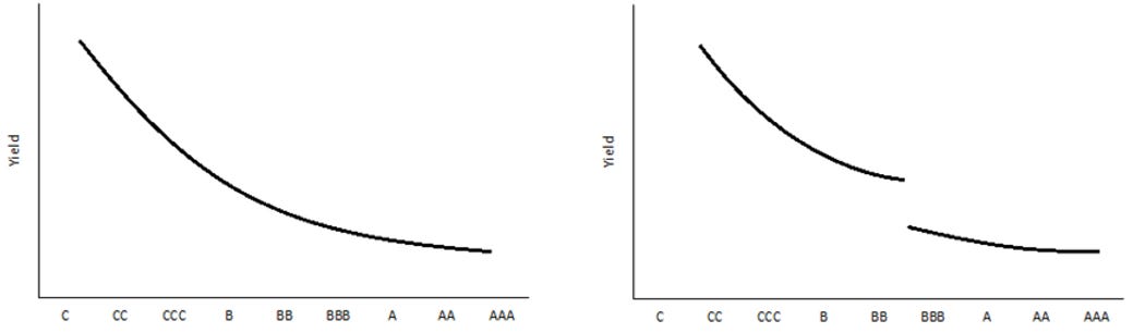 O, dicho de otra manera, los bonos BB+ son más baratos de lo que serían si no existiera toda la regulación de consumo de capital, mientras que los bonos BBB- son más caros de lo que serían si no existiera la regulación. Por tanto, si ponemos en un gráfico cuál es la rentabilidad exigida a cada tramo de rating, veremos que al pasar de investment grade a high yield hay un "salto", que hace que esta relación entre rating y yield no sea constante.